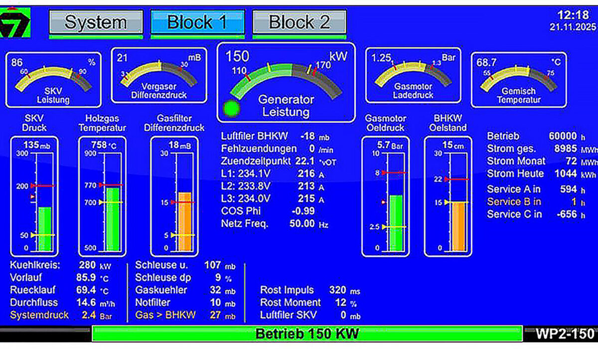 L’impianto fornisce 600 kW di calore per la produzione di pellet, la sala di piallatura e l’essiccazione, mentre 350 kW di elettricità vengono immessi nella rete. Questo rende l’azienda autosufficiente dal punto di vista energetico, economico e neutrale dal punto di vista delle emissioni di CO₂.